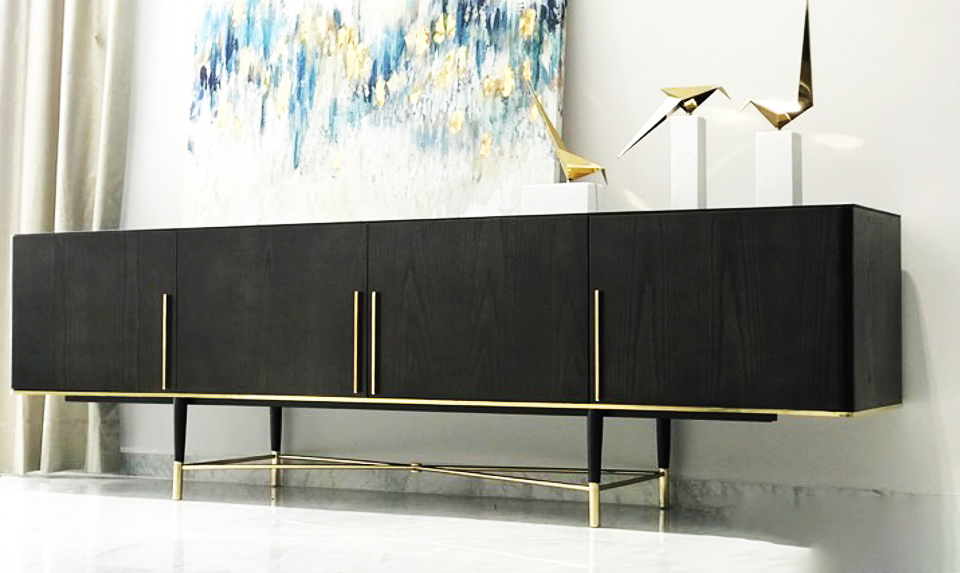 Le buffet Claridge en noir est élégant et sophistiqué, il rajoutera une once de raffinement à votre décoration, avec son support fin en doré. Ce buffet bas comprend 4 volets à portes ouvertures battantes comprenant diverses étagères.